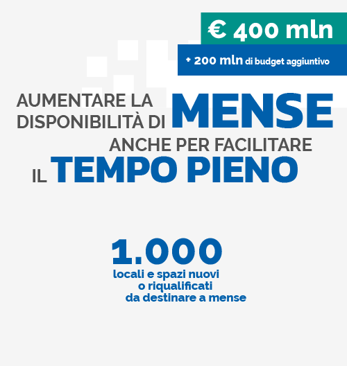 L’obiettivo di questa linea di investimento è garantire un potenziamento degli spazi per le mense, con la costruzione di nuove mense o la riqualificazione di quelle esistenti, in modo da favorire l’estensione del tempo pieno, ampliare l’offerta formativa delle scuole e rendere le stesse sempre più aperte al territorio, anche oltre l’orario scolastico.